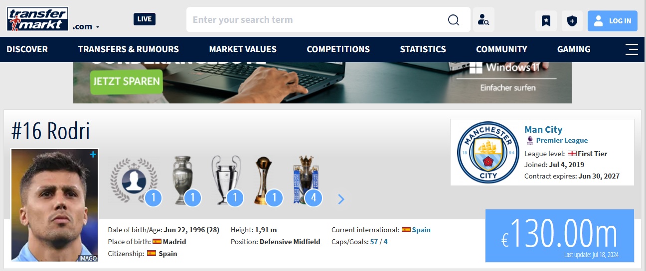 مجموع ارزش تمام تیم های لیگ بیست و چهارم مبلغی حدود 130 میلیون یورو است که طبق آمار همین سایت این رقم معادل ارزش رودری هافبک اسپانیایی تیم منچسترسیتی است.