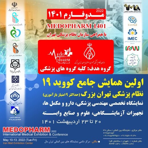 اولین همایش جامع کووید ۱۹ و نمایشگاه دستاوردهای دارویی و تجهیزات پزشکی کشور با عنوان مدوفارم از روز چهارشنبه بیستم اردیبهشت سال جاری به مدت سه روز با همراهی سازمان نظام پزشکی تهران بزرگ برگزار شد و با استقبال پرشور پزشکان و سایر دست اندرکاران حوزه سلامت مواجه شد.