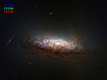 قرص کهکشان به سمت خط دید ما متمایل شده و به همین دلیل، رگههای غبار بهزیبایی در برابر نور زردرنگ ستارگان پیر و درخشش آبی ستارگان جوان آشکار شدهاند. نقاطی که در زمینه تصویر میبینید، کهکشانهای بسیار دورتری هستند.