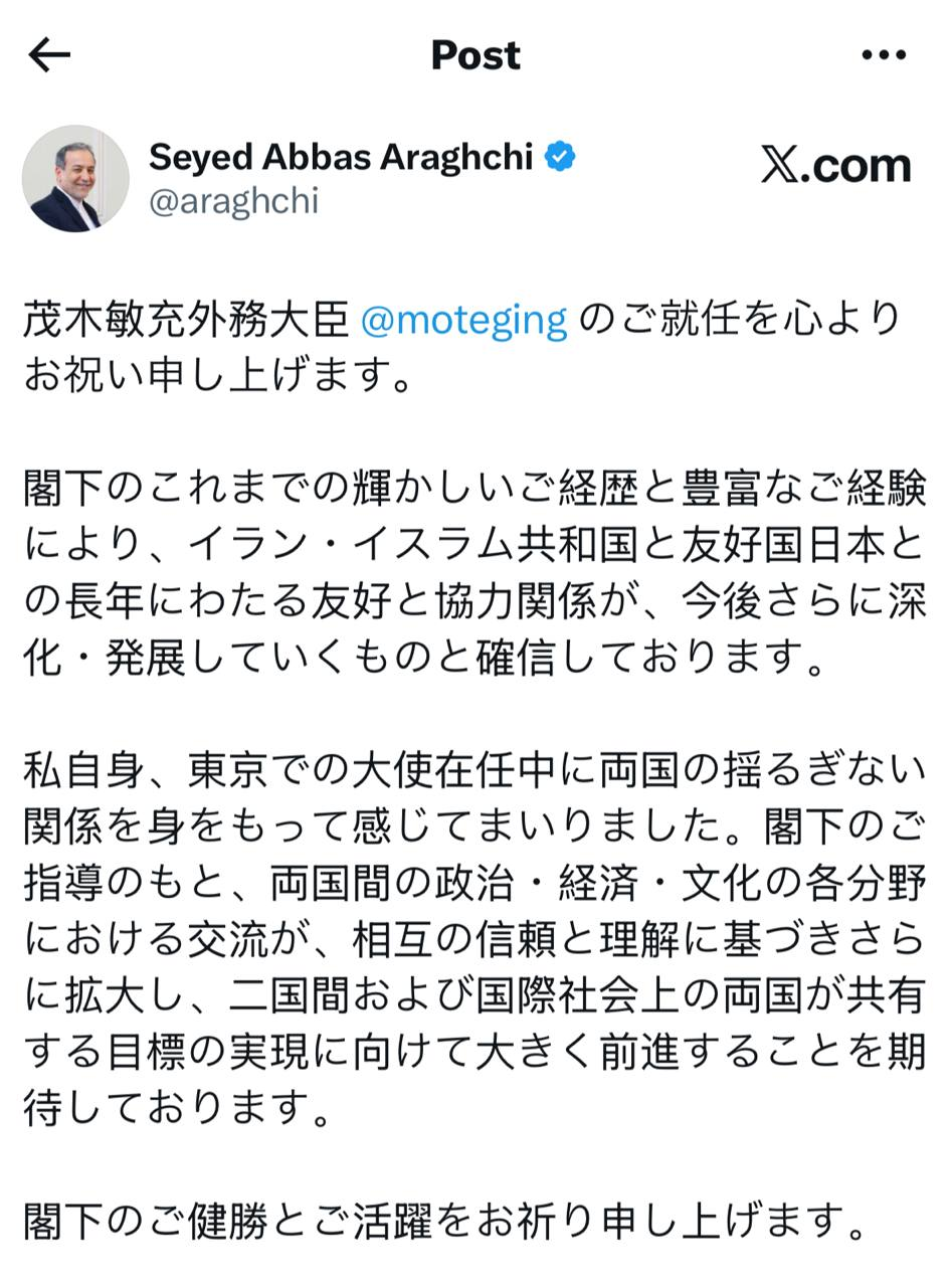 به گزارش ایسنا، متن پیام تبریک «سید عباس عراقچی» به وزیر خارجه جدید ژاپن بدین شرح است: